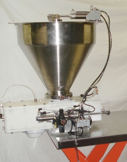 5 gallon ss hopper, type 304 and plastic product contact parts, stainless steel base, 2" dia. fill cylinder (fill range 1-12 fl. oz.),, filling nozzle and foot pedal